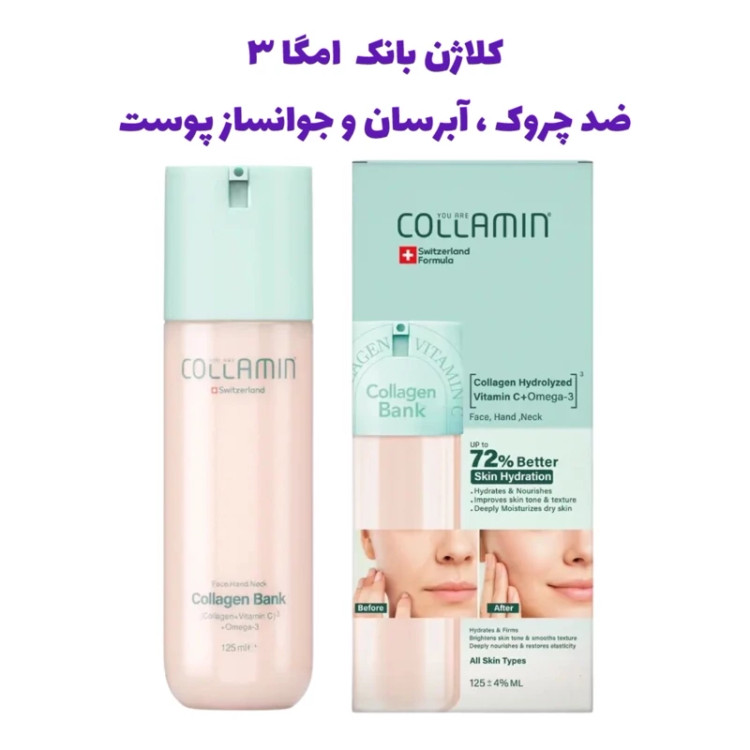 کلاژن بانک جوانساز و مرطوب کننده کلامین حاوی امگا 3 و ویتامین C حجم 125 میلی لیتر