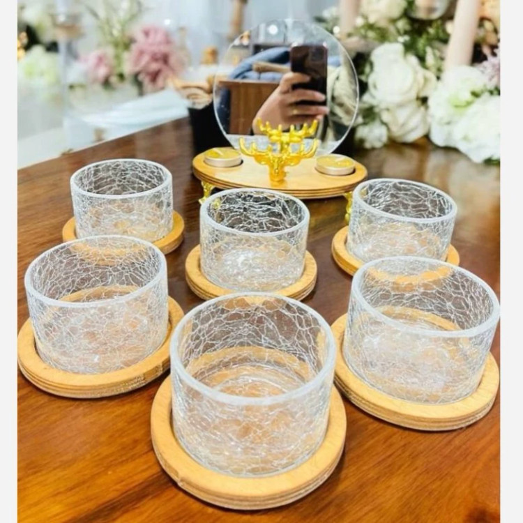 • ترکیب چوبهای طبیعی برشخورده با ظروف شیشهای دستساز باعث میشود که هر ست منحصربهفرد و خاص باشد.